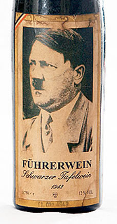 这瓶红葡萄酒产于1943年,当时的希特勒正如日中天。这瓶酒是为了庆祝其54岁生日而生产的。酒瓶的瓶颈上贴有鹰及纳粹的标志,并标明这是一瓶酒精含量12%的施瓦泽佐餐酒。