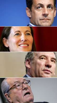 根据四家民意调查机构公布的数据,执政党候选人、前内政部长萨尔科齐以29.4%-30%的得票率名列第一位;罗亚尔以25.5%-26.2%的得票率列第二;中间派候选人贝鲁得票率17.8%-18.6%列第三;极右翼分子勒庞得票率10.6%-12%列第四。