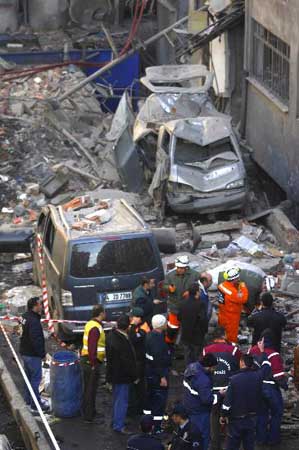 工作人员在土耳其伊斯坦布尔的爆炸现场救援。