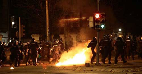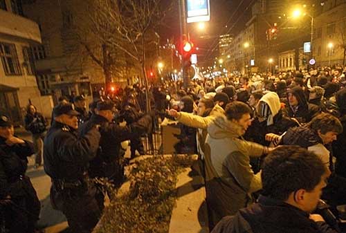 据联合早报网报道,大约一千名愤怒的塞族青年,到美国大使馆、一间美式快餐店和欧盟轮任主席国斯洛文尼亚大使馆投掷石块,并与防暴警察冲突,示威者又拆去欧盟旗帜,示威者又纵火、烧车,打烂大使馆的玻璃窗。防暴警察以催激气体及橡胶子弹驱散,又施放催泪气体和出动警棍驱散。