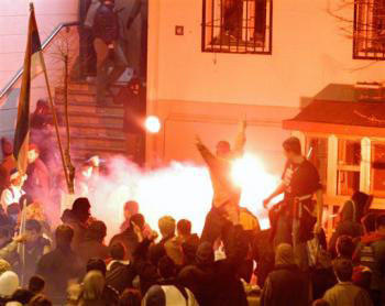 事件发生时,至少有15万塞族示威者在贝尔格莱德市中心举行集会,塞尔维亚总理科什图尼察对示威者发表了谴责科索沃独立的激情演讲。大部分塞族人把科索沃视作塞尔维亚的宗教和文化发源地。