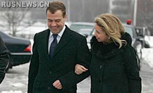 新一届总统的热门人选、俄第一副总理梅德韦杰夫偕夫人斯韦特兰娜则在驻地附近的第二六一四号投票站出现。四十二岁的梅德韦杰夫投票后表示心情不错:“春天已经来了,虽说有点小雨,也是令人惬意的插曲。毕竟季节已经变了。”