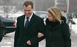 俄罗斯政府第一副总理、“统一俄罗斯”党总统候选人梅德韦杰夫3月2日携夫人在莫斯科第2614号投票站投票。 (俄新网图)