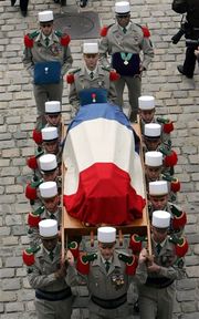 中新网3月18日电 综合报道,法国政府17日为去世的第一次世界大战最后一位老兵拉扎尔·蒙蒂塞利举行国葬,以此向所有参加过一战的法国军人致敬。法国总统萨科齐和前总统希拉克17日上午在巴黎荣军院参加为此举行的阅兵仪式,全国各地政府机关和学校等建筑下半旗致哀。