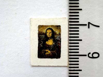这幅微缩版的作品是严格根据达·芬奇的《蒙娜丽莎的微笑》原画创作的。创作者、44岁的艺术家安德鲁·尼科尔斯按70:1的比例,用0000号的画笔蘸着丙烯酸颜料,并借助放大镜,在一张小卡片上完成了这幅作品。