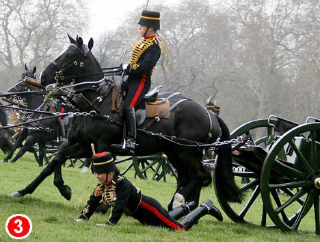 21日当天,英国皇家骑兵团的成员携礼炮向海德公园进发,一路上不少民众挤在道路两旁观看。忽然一名年轻的女炮手跌身下马,众目睽睽之下,她慌忙环视四周并立即翻身上马,以保证队列安全行进。英国《每日邮报》的记者眼疾手快,将女炮手摔下马的情景抢拍了下来。(梁陈聪)