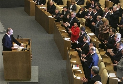 普京在国家杜马发表演说,阐述他在经济和军事方面的施政要点。