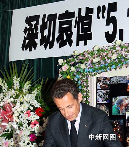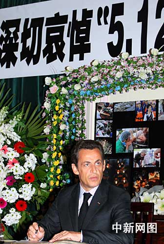 法国总统萨科奇悼念中国汶川地震遇难者。作 者:吴卫中