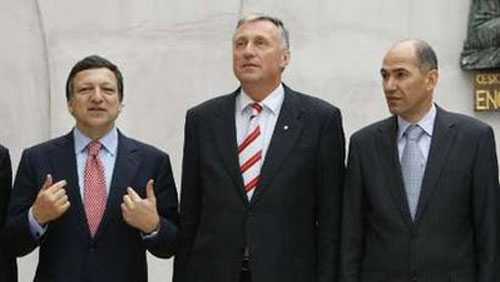 5月22日,欧盟委员会主席巴罗佐(左)在捷克首都布拉格呼吁欧盟各界就安全有效利用核能问题进行公开、透明的讨论。