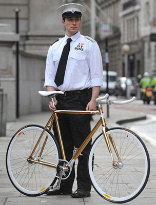这辆自行车受英国环境运输协会委托定制而成,链条、座位、车把手都和普通自行车的一样,不过表面却镀上了24克拉的黄金。由于在英国,售价超过4000英镑的自行车都不能享受保险“待遇”,因此购买这辆自行车的人还必须雇一位“保镖”,在公共场合负责看管。