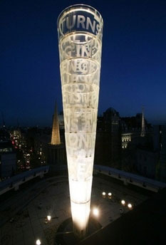 这座玻璃和钢制成的圆锥形纪念碑位于英国广播公司(BBC)大楼顶部,是在BBC的两名记者早先分别在阿富汗和索马里殉职后开始设立的。