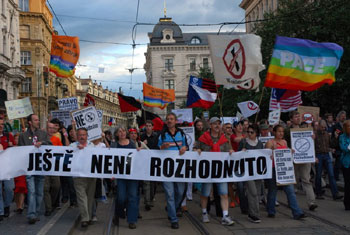 数千捷克民众8日傍晚在布拉格举行示威游行,抗议政府签约同意美国在捷克建立反导雷达基地。黄频摄影
