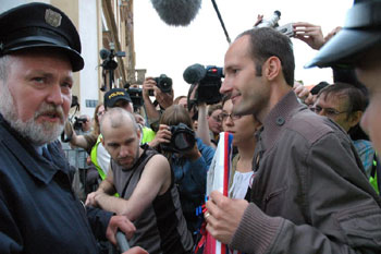 示威民众8日傍晚在布拉格外交部外面要求警察向正在外交部内享用晚宴的赖斯转交一封公开信,但被以“安全理由”拒绝。黄频摄影