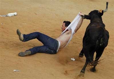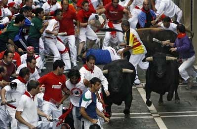 为期9天的奔牛节,于6日早晨开始,人们把公牛赶到一起,在街上狂奔;人们倾巢而出,充塞街头,最后跑向斗牛场,与牛共舞。