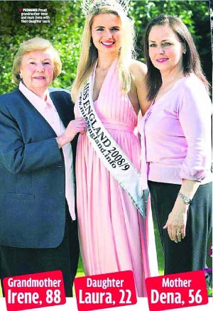 如今劳拉也成了家中的第3代“选美皇后”,刚刚当选为“英国小姐”的劳拉将于今年10月代表英国前往乌克兰角逐“2008世界小姐”的桂冠,劳拉对记者说:“当选‘英国小姐’让我感到快乐,因为它不仅和外貌有关,也和性格有关。”据悉,劳拉14岁时就开始充当模特,并在2005年当选为“莱斯特小姐”,当年她参加“英国小姐”竞赛时,获得了第4名的成绩。