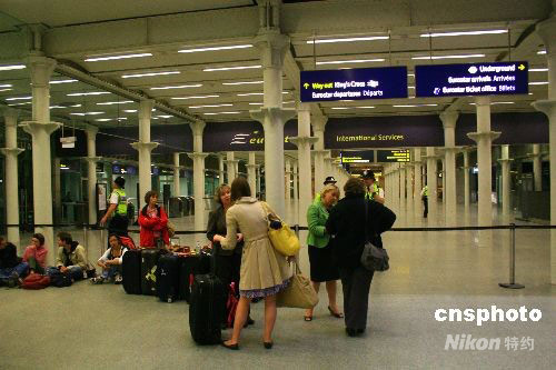 图为11日晚间,伦敦圣潘克斯火车站取消了前往巴黎和布鲁塞尔的列车,现场滞留的乘客被迫排队等候订酒店。
