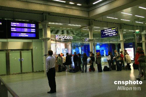 图为11日晚,警察封锁了欧洲之星火车的出发站台,现场有乘客焦急等候。