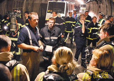 英法的消防员在紧急逃生管道集合,准备进入隔壁大火的列车管道扑救。