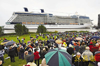 据香港《文汇报》30日报道,“名人至尊号”日前在两艘拖艇协助下,驶过德国帕本堡迈尔造船厂的水闸,驶出北海,将前往丹麦。这邮轮的造船工程大致完成98%,将于本年11月正式处女首航,成为一艘美国旅游船。