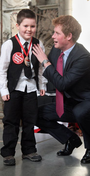 在颁奖典礼上,24岁的哈里蹲下身拥抱每一个获奖儿童,给予他们充满温暖的问候和笑容。为了缓解孩子们的紧张,哈里一直用手轻拍他们的后背。他小心翼翼给一个小女孩戴上奖牌唯恐碰到女孩头发,让人实在无法想象他曾是一个醉醺醺出尽洋相的“混世魔王”。这位“爱心王子”的用心,让每一个紧张的孩子露出可爱的笑脸。