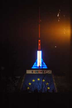 中新网1月1日电(黄频) 2009年元旦零时,装置在捷克首都布拉格格莱德纳公园“时间机器”雕塑上的担任欧盟轮值主席国的象征性标志开始发光摆动,标志捷克开始执掌欧盟帅印。