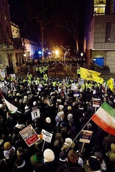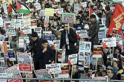 在伦敦,数千人手持巴勒斯坦旗帜,在首相府外抗议,部份示威者又向首相府扔鞋。
