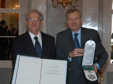 中新网布达佩斯3月12日电 今天上午,在布达佩斯访问的北约秘书长夏侯雅伯(右)接受了匈牙利总统绍约姆•拉斯洛授予的“匈牙利共和国大十字勋章”。