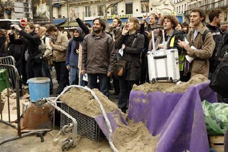 索邦大学(Sorbonne)学生们盛装上演了一系列街头活动,其中有学生身穿中世纪服装,表演了场“萨科齐受审”的模仿剧。