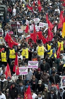 参加示威的主要是居住在英国的泰米尔人,以及他们的支持者。示威者要求英 国停止向斯里兰卡继续提供援助。