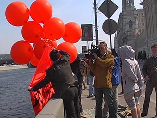 据俄罗斯新闻网报道,俄罗斯反对党“团结运动”组织成员4月28日在克里姆林宫前举行了声势浩大的反政府游行活动。期间,3名“团结运动”的积极分子在克里姆林宫附近的河岸边悬挂红色的巨型横幅,上面印有:“梅德维杰夫,辞去普京总理职务。”字样,横幅两边系有红色的气球,横幅下部印有“团结运动”组织的徽标。
