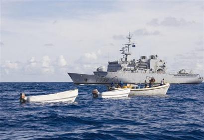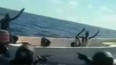 据英国媒体报道,5月4日,法国海军将抓获11名索马里海盗的录像公布于众。法国海军在塞舌尔岛以外海域俘虏11名索马里海盗。当时,这些海盗蒋法国军舰误认为是商船。据报道,事实上,海盗们想袭击的是参与欧盟打击海盗行动、在当地海域巡逻的法国导弹护卫舰“雪月号”。