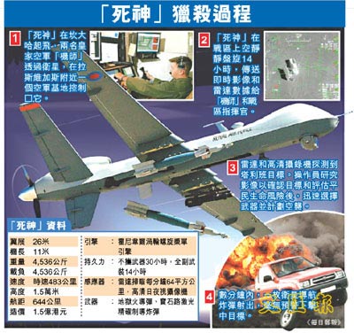 英国国防部消息透露,过去10日,两名“机师”在美国内华达州拉斯维加斯外的克里奇空军基地,透过卫星控制价值1000万英镑的“死神”(Reaper),在1.1万公里外的阿富汗南部探测目标,然后进行空袭,成功杀死一名重要塔利班领导人。