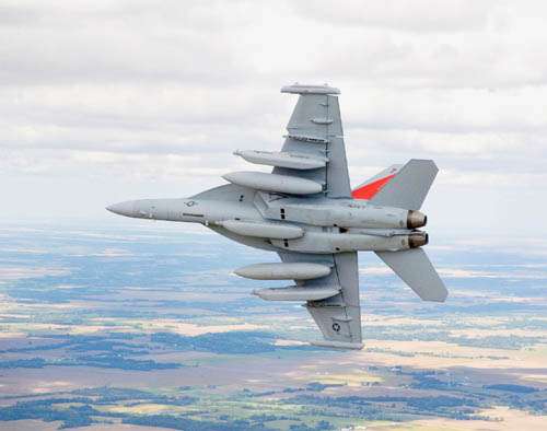 由波音公司生产的EA─18G“咆哮者”电子作战高性能战机,是属于FA─18“大黄蜂”型战机的改良型先进战机。EA─18G“咆哮者”可以携带反雷达空地导弹的电子作战军机,能够在极短的距离内起飞降落,同时有干扰敌方雷达与电子装备的能力。美军在伊拉克就是使用旧版“咆哮者”来干扰路边炸弹的引爆讯号。