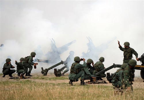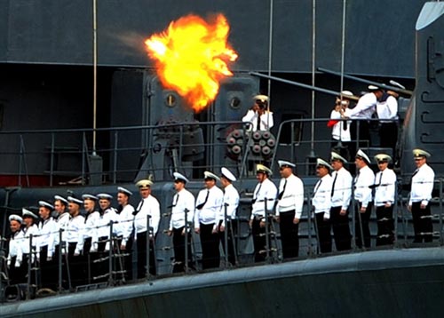 委内瑞拉海军部队在陆上鸣炮还礼。