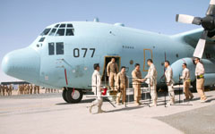 日本航空自卫队的C130运输机机组成员完成在伊拉克的最后一次运输任务。摄于12日。(共同社)