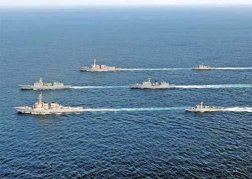 中新网3月17日电 据韩国《中央日报》报道,3月16日,参加“关键决断”联合军演的韩国海军第一舰队司令部下属的战斗舰和美国海军宙斯盾驱逐舰正在东海上进行启动训练。美国海军STETHEM舰(9000吨级,第一列的最前面)、大祚荣舰(4500吨级,第二列最前面)和广开土大王舰(第二列左边第二个)、CHAFFEE舰(9000吨级,第三列最前面)等和警戒舰正在启动。
