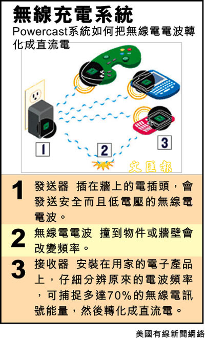 据香港《文汇报》报道,无线充电系统由Powercast公司开发,声称整个系统绝不比一部收音机复杂,而且造价低廉,基本接收装置成本只需5美元。具体装置只需一个安装在墙身插头的发送器,以及可以安装在任何低电压产品的“蚊型“接收器,它会把无线电波转化成直流电,可在约1米范围内为不同电子装置的电池充电。