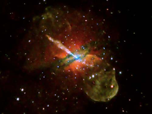 图片中的左上角是一条延伸距离达1.3万光年的X射线喷射物,以及一条向反方向延伸的较短的“反向喷射”。天文学家认为,这种动力射流起到了重要的运输作用,把来自黑洞的能量传递到规模更大的星系,同时还影响那里恒星的速度。