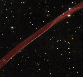 科学家表示,这个残余其实是来自恒星爆炸的部分冲击波。而且,暴动的残余还在爆炸之中,每小时大约移动1千万公里。哈伯图像主要是由残余的氢原子发射出的可见光、蓝光、黄绿光和近红外线光共同生成的合成图像。这个扭曲光带的明亮部分是来自爆炸的冲击波位于我们视线的边缘。