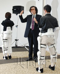 筑波大学教授山海嘉之(中)正在讲解“机器人Suit HAL”如何帮助老年人及残疾人。