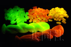 这种蚕被导入了水母、珊瑚等的荧光蛋白质基因,所结的茧在自然光照射下呈淡绿色或粉色,但经蓝色发光二极管等光线照射后,通过滤镜观察则呈荧光色。