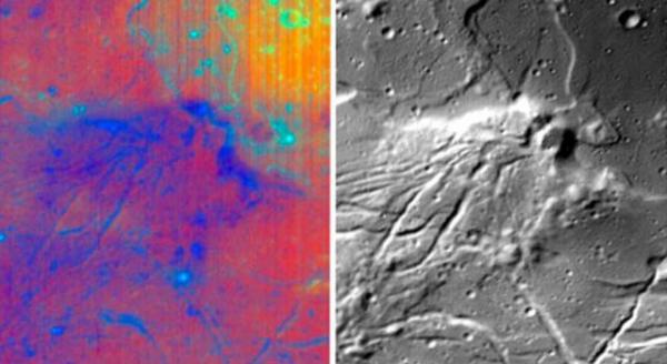 此图是由该飞船装配的美国宇航局月球矿物质绘图仪拍摄。月球矿物质绘图仪是"月球初航1号"首个提供月球表面高清晰度图像的仪器,其所拍摄的这张彩色图像不仅具备传统二维图像的长和宽,还通过颜色呈现其空间尺度。这种彩色是由28种不同波长的光线从月球上反射形成的。其中,从蓝色至红色揭示了岩石和矿物成份的变化,绿色则代表像辉石这样含铁丰富的矿石。黑白图像是单个波长的光线所获得的图像,可以重新认识这一月球表面区域的结构和形成。