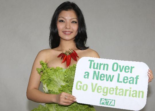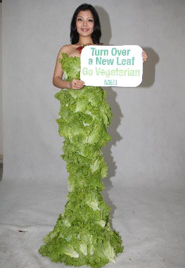 组图:蒙古国女歌星身穿生菜叶宣传素食主义