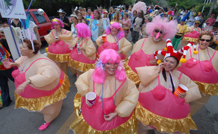 历时10天的活动里,彩车上的人们有的身着盛装,有的扮成动物,甚至有几名女子打扮成前白宫实习生莱温斯基的样子,也有狂欢者站在花车上撒钱。