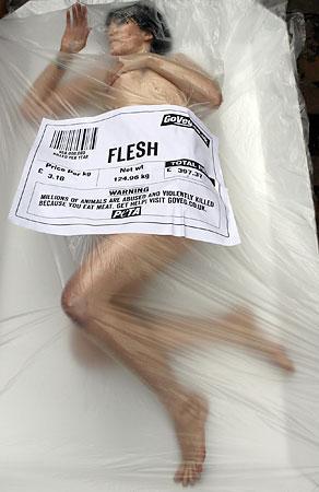 这个貌似恐怖的包装袋实际上是动物爱护团体的活动者们对虐待屠杀动物进行抗议的街头表演。