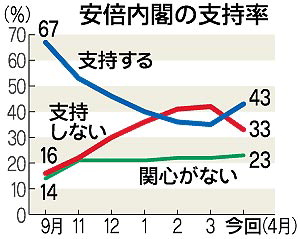 《每日新闻》的这次民调是在28,29日两天进行的。该结果显示,安倍上周访美并与美国总统布什会面后,安倍内阁的支持率由35%升至43%。不支持安倍的比率减少9个百分点至33%。这是自安倍去年9月上任以来,民望得到的进一步回升。安倍刚刚就任日本首相时,民众支持率曾一度接近70%,随后持续下降。