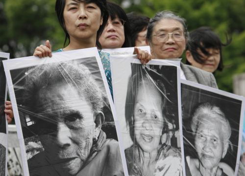 示威的人们手举“慰安妇”的照片,要求日本政府“明确承担历史责任”并向受害者“直接谢罪和赔偿”。