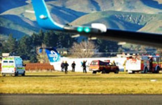 这架新西兰航空小客机,机上载有17名乘客,原本预计要在新西兰威灵顿降落,却在途中发现,飞机机轮故障,起落架无法打开。于是机长临时在布兰尼姆镇以机腹着地降落。