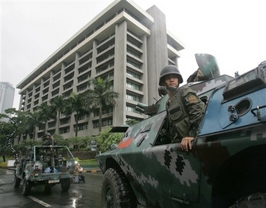 有目击者称,约50名警方特种部队成员配发防毒面罩,在半岛酒店外排成一线。目前菲律宾方面已经出动1500名士兵对该酒店实施包围。阿罗约已经就此召开紧急内阁会议,商讨对策。