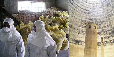 左图为,为了核去功能化解除的隔热砖,右图为,已被虚空的冷却塔内部。